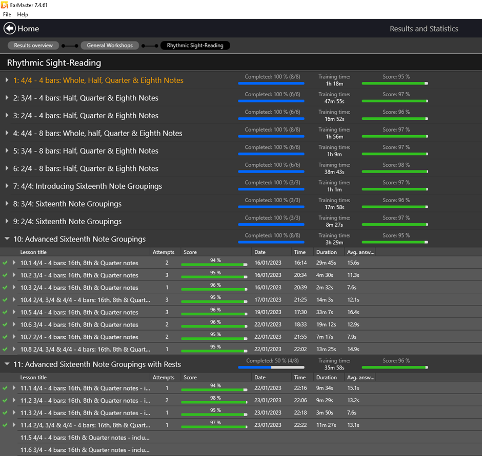 Regarding EarMaster – It has really improved in its capacity to use an interface and hence a guitar to input a response. With this realisation I began to play through a course on ‘reading rhythm’ really valuing the real-time responsiveness of the program to show me where my playing is in terms of the beat. I have found that this is effective to deliver immediate analysis and evaluation on my ability to play a rhythm and to challenge me with random rhythmic tasks.